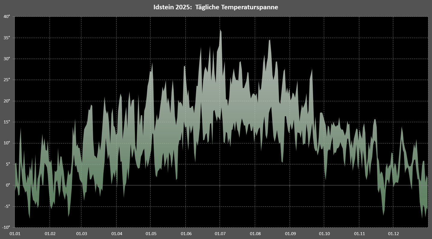 Aus den täglichen Mindest- und Maximalwerten lässt sich die tägliche Temperaturspanne darstellen: