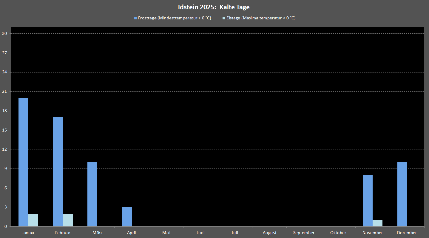 Zunächst die Frosttage und als Untermenge davon die noch kälteren Eistage. Zum besseren Verständnis der Darstellung: