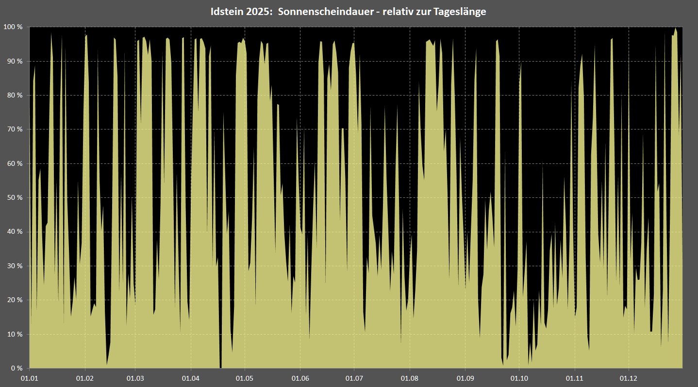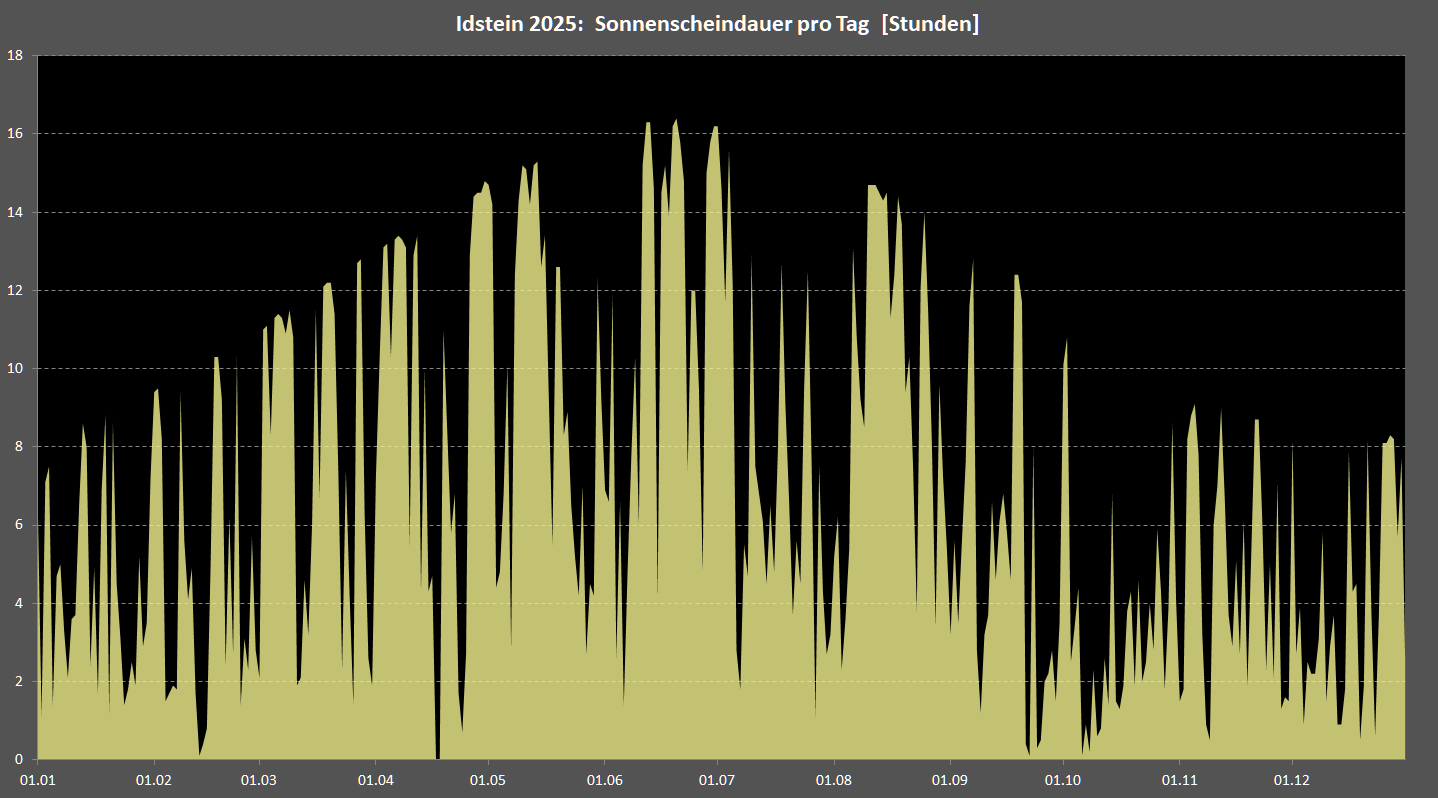 Betrachten wir zunächst die tatsächliche Sonnenscheindauer - in Stunden pro Tag - im Verlauf des ganzen Jahres 2025: |
