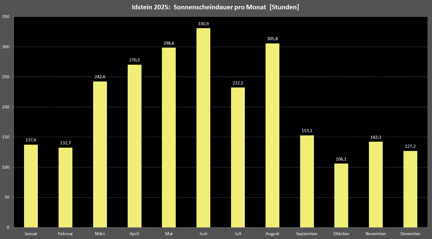 Betrachten wir nun die summierte Sonnenscheindauer pro Monat, so zeigte der Juni mit über 330 Stunden den meisten und der Oktober mit 106 Stunden den wenigsten Sonnenschein: |