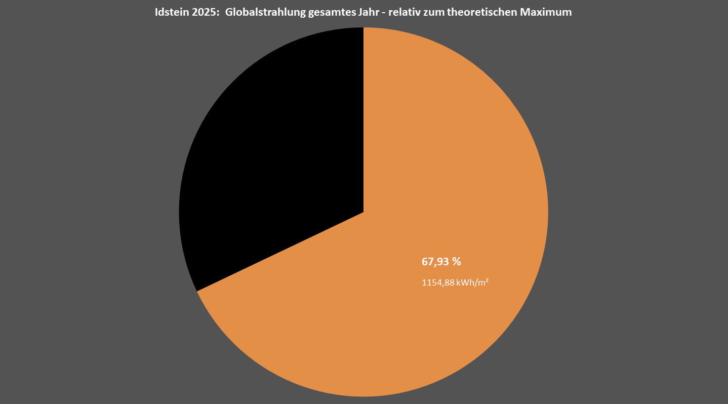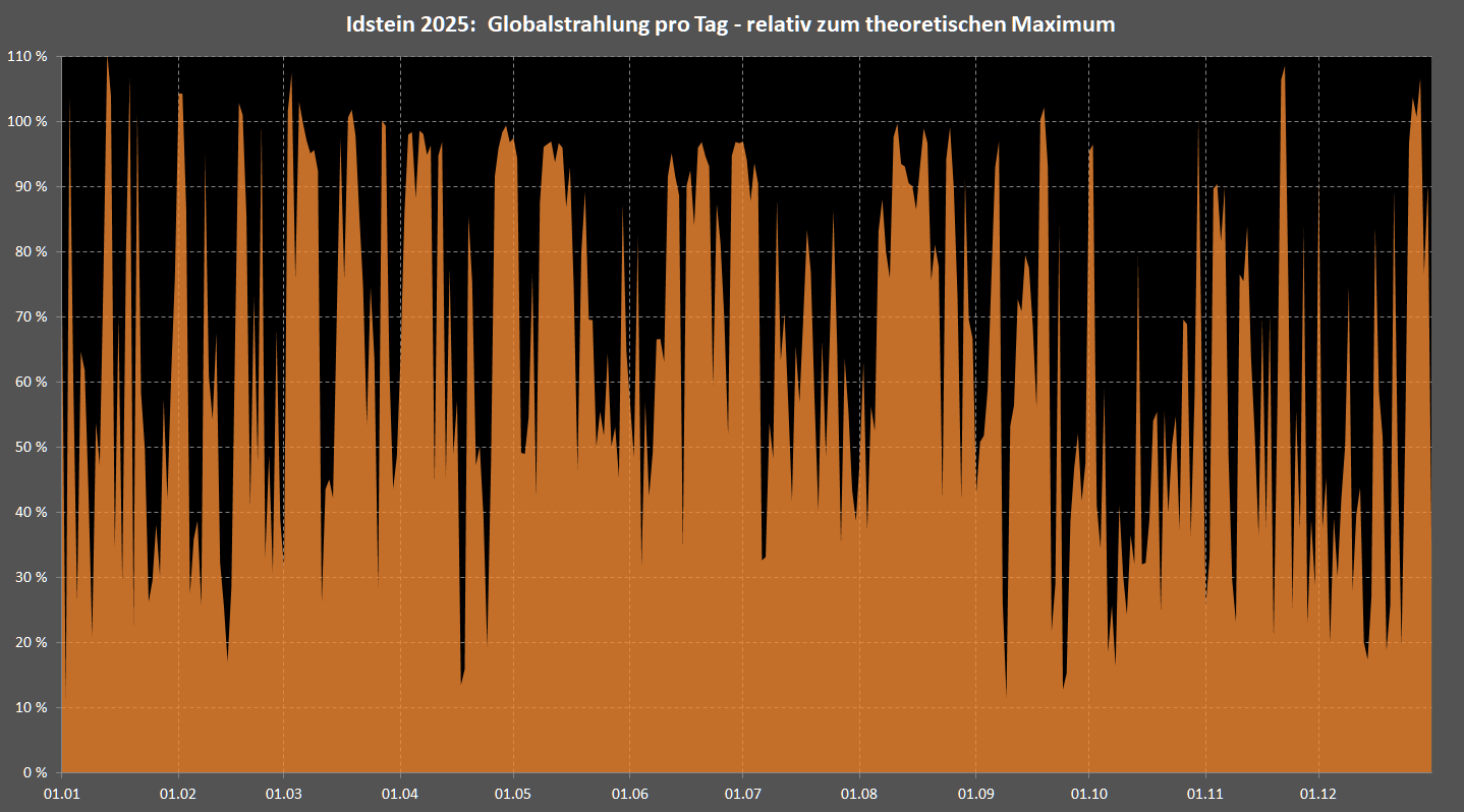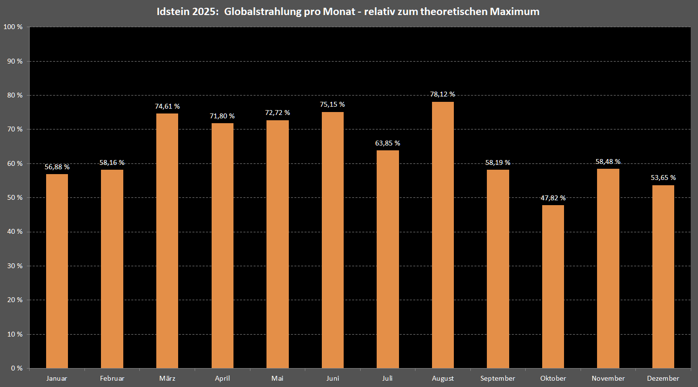 Betrachten wir allerdings das Verhältnis von tatsächlicher zu maximal möglichen Globalstrahlung eines jeden Monats, verändert sich das Bild beträchtlich, und es ergibt sich etwas vergleichbares wie die Grafik mit der relativen Sonnenscheindauer: |