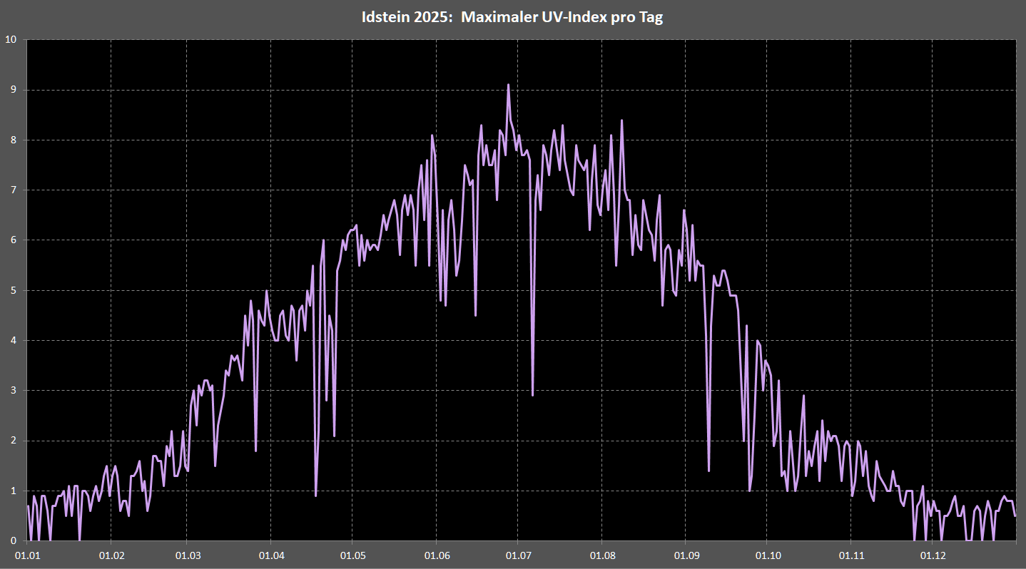 Im Sommer verdampft wesentlich mehr Wasser in die Atmosphäre. Die Wasserdampfmoleküle trüben die Atmosphäre, so daß die (relativ betrachtete) Sonnenstrahlung im Sommer abnimmt. Im Winter kann daher die Durchlässigkeit der Atmosphäre - an sonnenreichen Tagen - höher sein. Sonnenreiche Tage haben im Winter den Nebeneffekt, daß tagsüber weniger geheizt werden muss, wodurch insbesondere der Feinstaub der Holz- und Pelletöfen, die auch einen trübenden Effekt haben, geringer ausfällt. Zum anderen ergeben sich im Winter, wenn die Sonne die meiste Zeit sehr flach am Horizont steht, manchmal Situationen, an denen die Sonne sich an (noch) tiefer am Horizont stehende Wolken spiegelt. Dadurch gelangt in der Summe deutlich mehr Strahlung zu uns, als dies ein theoretisches Model bei wolkenfreiem Himmel hergeben könnte. Wegen der kurzen Tage im Winter reichen wenige Stunden mit solchen Sondersituationen aus, um die gesamte Tagesbilanz über 100 % zu drücken. Der aus Solarmodulen bekannte Effekt, der für niedrigere Leistungen bei hohen Modultemperaturen im Sommer sorgt, hat hier übrigens keinen Einfluss. Nebenbei bemerkt: das Modell, das zur theoretischen Berechnung der Maximalstrahlung verwendet wird, berücksichtigt etliche Faktoren. Darunter die variierende Entfernung der Erde zur Sonne (im deutschen Sommer sind wir etwas näher zur Sonne dran, wodurch die Globalstrahlung etwas ansteigt). Und es wird ebenfalls die Sonnenhöhe über dem Horizont im Tagesverlauf berücksichtigt, sowie die mit einem tieferen Sonnenstand einhergehenden Abschwächung des Sonnenlichts, da die Lichtstrahlen wesentlich mehr Atmosphäre durchdringen müssen, bis sie uns erreichen. Der Verlauf der Globalstrahlung sowie der theoretischen Maximalstrahlung können übrigens unten auf der Hauptwetterseite eingesehen werden. Die Globalstrahlung wird dabei als gelbe Kurve dargestellt, und die theoretische Maximalstrahlung als graue Kurve. Abschließend eine Übersicht des maximal gemessenen Indexes der UV-Strahlung an jedem Tag des Jahres 2025: |