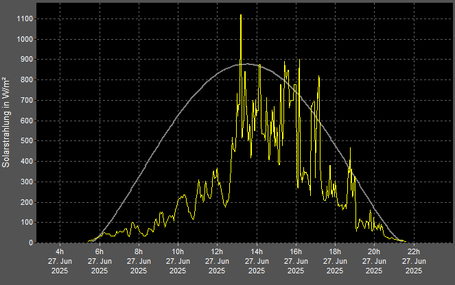 Dieser Effekt führt auch dazu, daß die Globalstrahlung deutlich über der theoretischen Maximalstrahlung ansteigt. Dies führt dann für unsere Augen zu einer starken unangenehmen Blendung. Hier am Beispiel just des 27. Juni 2025, die graue Kurve zeigt wie gesagt den theoretischen Maximalwert und die gelbe Kurve die tatsächlich gemessene Globalstrahlung: |