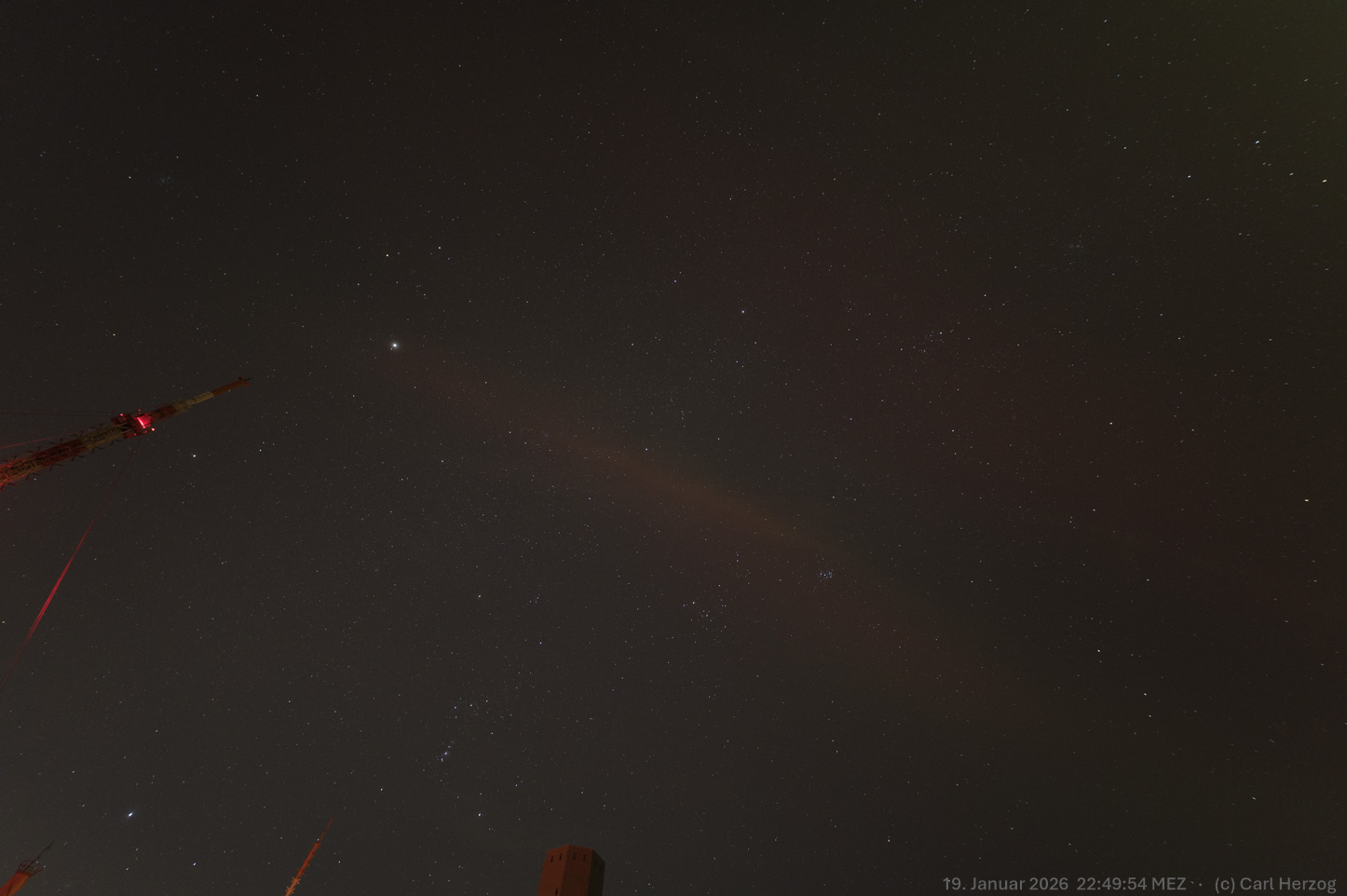 matt-rötlich ein Polarlichstreifen, der in Ost-West-Richtung orientiert war. Und etwas darüber ist ein diffuses