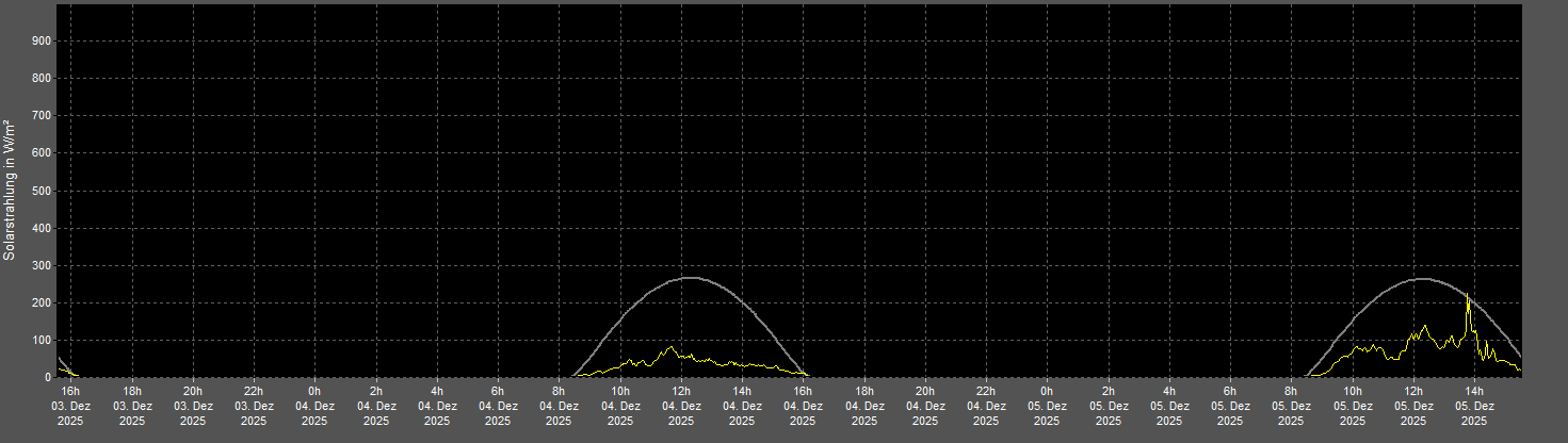 grauße Kurve die maximale theoretische Strahlung bei klarem Himmel. Dabei kann die gemessene Strahlung