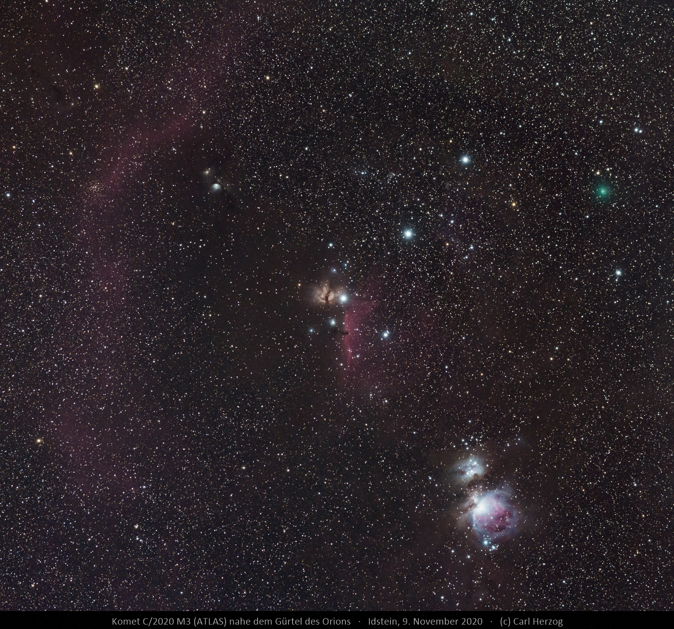 Komet C/2020 M3 (ATLAS), rechts oben als grün-leuchtender Fleck zu erkennen, als er am 9. November 2020 das Sternbild