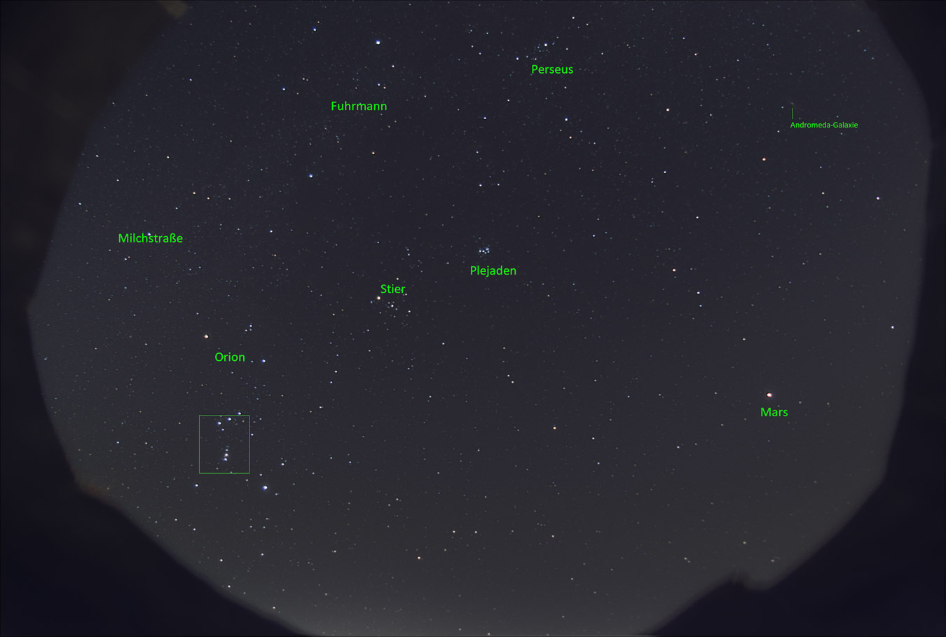 Himmelsanblick an einer dunklen Nacht im Dezember 2020, vom Gänsberg Richtung Süd-Südwest schauend. Das grüne Rechteck links unten markiert den Bereich, der in diesem Foto des → Pferdekopf- und Orionnebels aufgenommen wurde. |