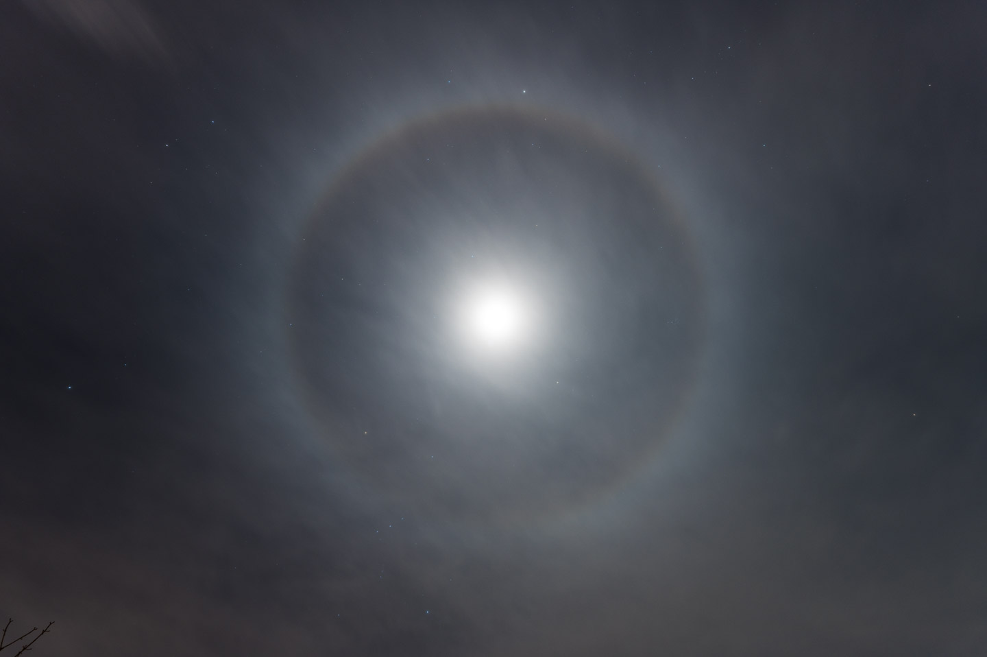 In der Nacht vom 24.01.2021 kam es zu einen kleinen Halo oder 22° Ring um den Mond herum. Er ensteht durch Brechung