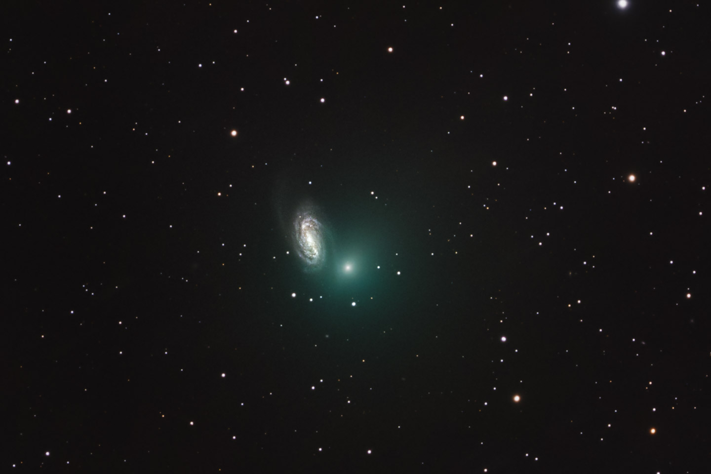 Galaxie NGC 2903 vorbei. Die grünleuchtende Koma des Komets verfinsterte dabei die dahinterliegende Galaxie.