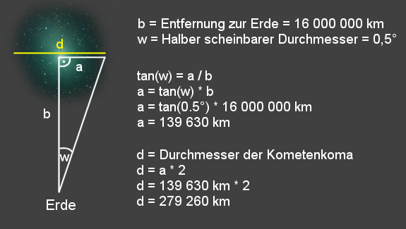 Mond mit seiner grünleuchtenden Koma gefüllt, da die Entfernung zwischen Erde und Mond im Mittel 384 400 km beträgt.