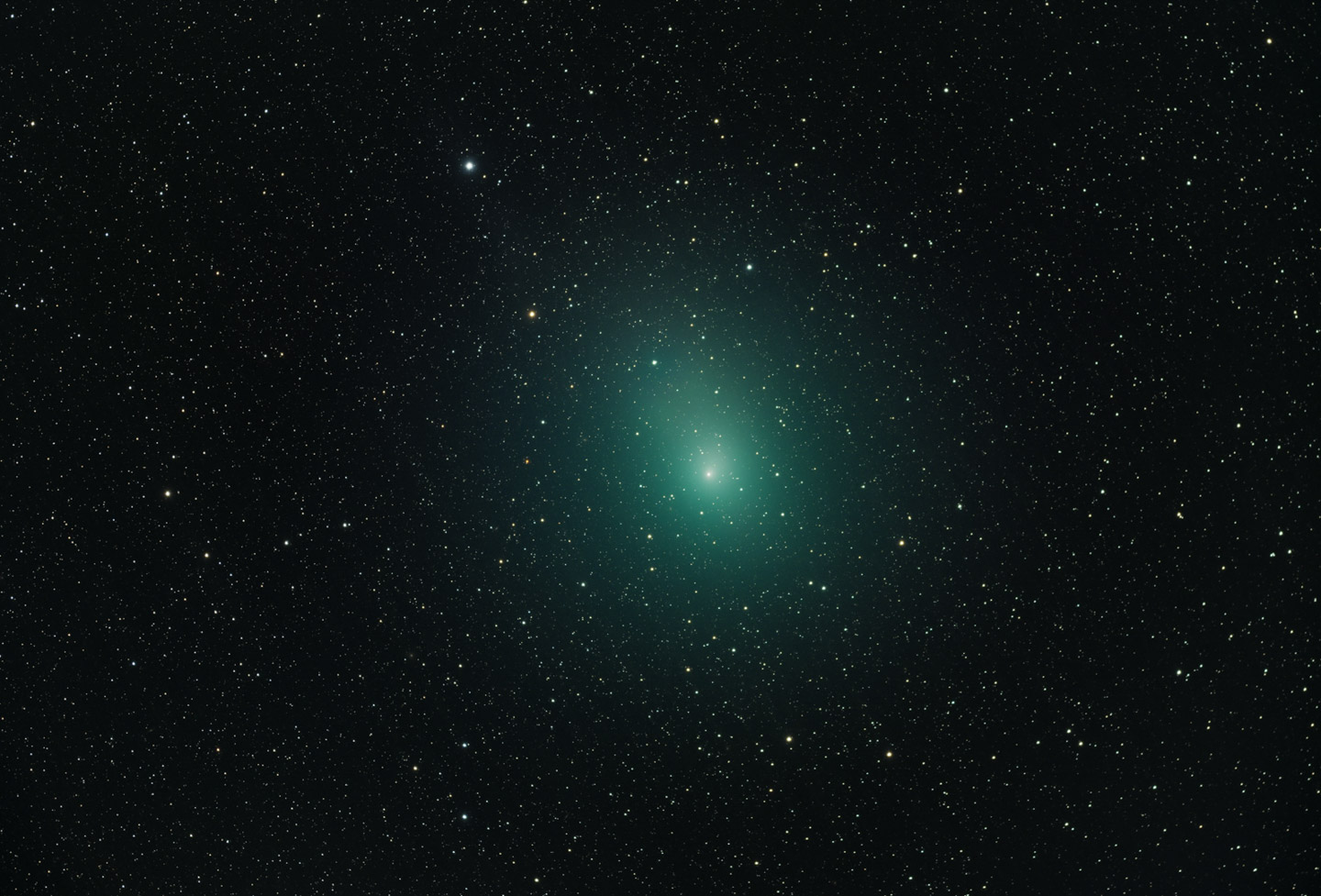 46P/Wirtanen selbst ist sehr klein, er hat nur ca. 1 km im Durchmesser. Aber seine grünleuchtende Kometenkoma, die durch Interaktion des Sonnenwindes mit den aus dem Kometenkern sublimierten Gasen entsteht, kann hunderttausende km groß werden. Da es sich um einen sehr kurzperiodischen Kometen handelt, der in nur 5,4 Jahren die Sonne umrundet, können wir ihn in wenigen Jahren wiedersehen. In 2018 kam er allerdings der Erde außerordentlich nahe: am 16. Dezember war er nur 30 Mal weiter von uns weg als der Mond. Dadurch erschien die Kometenkoma besonders groß - in etwa doppelt so groß wie der Vollmond. Aber bei weitem nicht so hell. Etwas Mathematik