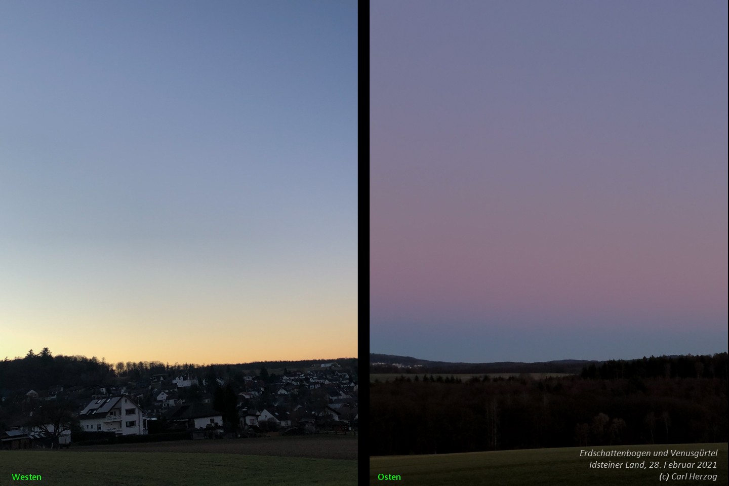 rechts im Bild der gegenüberliegende Horizont mit dem Erdbogenschatten und dem Venusgürtel.