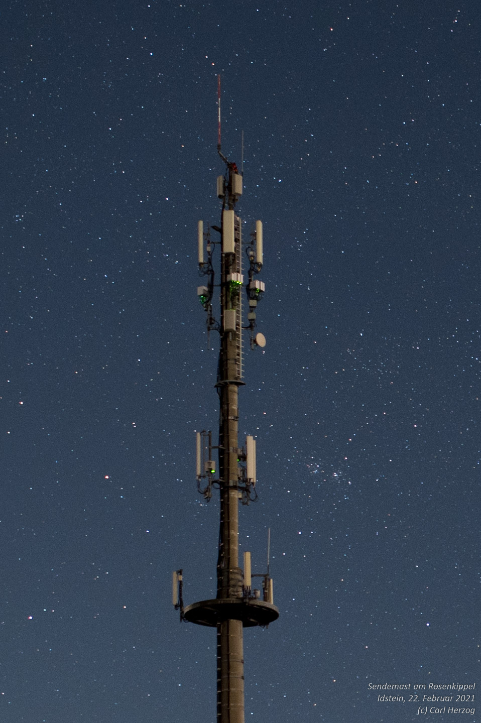 Das Foto entstand am 22. Februar 2021, als der ca. 3/4 volle Mond die Landschaft und den Himmel mit Licht durchflutete. Rechts im Hintergrund ist ein Doppelsternhaufen zu sehen, der sich zwischen den Sternbildern Perseus und Kassiopeia befindet und ca. 6700 Lichtjahre von uns entfernt ist - also ein Katzensprung. Auf ca. ein Drittel des Weges dorthin fliegt man seitlich am Herz- und Seelennebel vorbei. Der Rosenkippel ist ein kleiner Gipfel im Westen Idsteins, der 379m hoch ist. Dort steht dieser 42m hohe Sendemast, an dem Antennen für Mobilfunk und Funkruf sowie Antennen von Funkamateuren angebracht sind. Vom Rosenkippel gehts ostwärts steil runter zur Autobahn A3, die am 23. September 1939 an diesem Teilstück den Betrieb aufnahm. Von dort geht es weiter steil zur Stadt herunter. Man stelle sich dieses steile Stück um das Jahr 1900 herum als Ganzes ohne die Autobahn und ohne McDonalds vor, das muss eine traumhafte Skipiste gewesen sein, Schussfahren bis zur heutigen Feuerwehr. Zumindest auf der Westseite unterhalb des Rosenkippels deuten zeitgenössische Dokumente das Schlittenfahren an, am Beispiel eines lustigen → Kinderplans der Umbebung aus dem Jahr 2009. Seit letztem Jahr ist der Rosenkippel in den Schlagzeilen, da dort ein Aachener Unternehmen eine Photovoltaikanlage auf rund acht Hektar Fläche bauen möchte. Da fragt man sich als Wetterbeobachter: Wind gibt es hier ja genug, aber Sonne? |