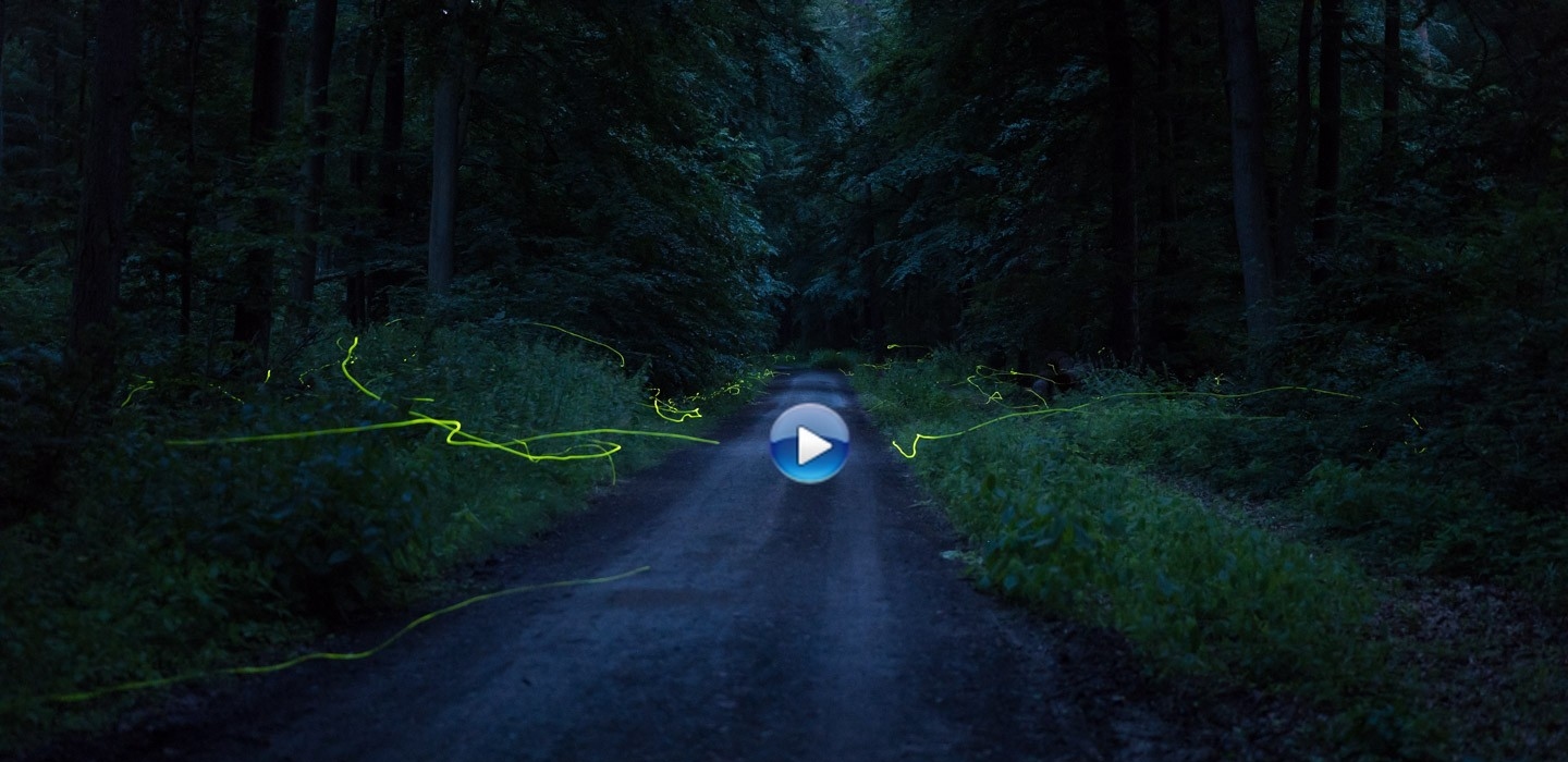 Die Unterbrechungen der Leuchtspuren in dieser Collage kommen von den kurzen Pausen zwischen den Aufnahmen. Die Glühwürmchen