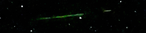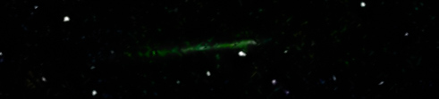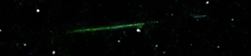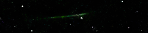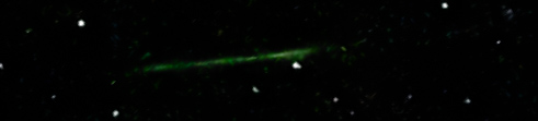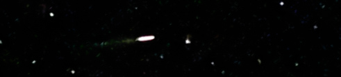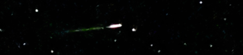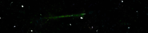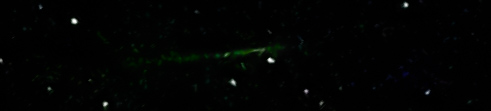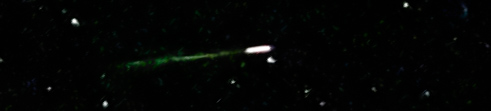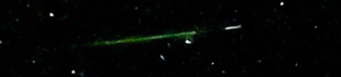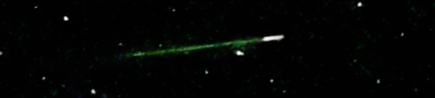 Das Video dient zur Veranschaulichung des letzten Beitrags, bei dem das Verglühen des Meteoroiden (als helle Speerspitze zu erkennen) und der zeitlich versetzt entstehende grüne Ionenschweif beschrieben wurden. Ganz anders wirkt ein Foto mit mehreren Sekunden Belichtungszeit, da die Sternschnuppe - wie beim Light-Painting (Malen mit Licht) - eine helle durchgezogene Linie entstehen lässt, die in Wirklichkeit ein blitzartig vorbeihuschender Feuerball war. Das Video wurde mit 25 Bildern pro Sekunde aufgezeichnet und wird 5-fach verlangsamt abgespielt. Die 5 Sekunden des Videos spielten sich in Wirklichkeit in nur einer Sekunde ab. |