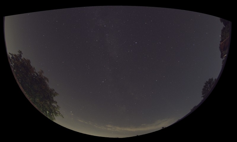 Während die alte Kamera eine Art "Guckloch" in dem Himmel war, erzeugt die neue Kamera Bilder, die optisch einem 180° Panorama entsprechen. Dabei entsteht eine kugelförmige Projektion der Himmelssphäre, die den Horizont in allen Himmelsrichtungen erfasst und darstellt. Allerdings wird die obere Hälfte dieser Kugel (auf der Nordseite) abgeschnitten, da dort die Sicht durch die eigene Hauswand geblockt wird. Noch. Zum Vergleich der Himmelsanblick mit der neuen Kamera (oben) und der alten Kamera (unten) am gleichen Augenblick: ![]() ![]() Ein kleiner Wermutstropfen bleibt ein mittlerweile über 9 Meter hoher Kastanienbaum, den die Stadt bisher nicht in der Höhe begrenzen möchte. Dieser blockiert - trotz der hohen Kameraposition - den Blick Richtung Südosthorizont beträchtlich, und damit auch einen guten Teil rund um die Bahn der Ekliptik, wo Planeten, die Sonne und der Mond laufen, die dann für mehrere Stunden nicht beobachtbar sind. Darunter fallen auch Sonnen- und Mondfinsternisse, denen in der Astronomie eine besondere Bedeutung zukommt. Der größere Himmelsausschnitt bringt zudem eine höhere Störempfindlichkeit gegenüber Blendlicht mit sich. Vor allem die künstlichen Lichtquellen lassen viele Reflektionen in der Optik entstehen, so dass die nächtlichen Himmelsbilder unbrauchbar werden, wie die ersten Testläufe zeigten. Durch die Herstellung eines speziellen Hütchens für die Kamera ist es aber - nach mehreren Anläufen - zumindest gelungen, die Straßenlampen sowie die Außenbeleuchtungen der Nachbarhäuser von der Optik abzuschirmen. Diese Abschirmung und die Tatsache, daß die Kamera keine lange Dunkeladaption wie das menschliche Auge benötigt, sind zwei der Hauptgründe, warum die Kamera nun wesentlich mehr Sterne darstellen kann, als wir aus unseren Gärten, Balkonen oder Fenstern heraus mit bloßem Auge erkennen können. Eine weitere Besonderheit der neuen Kamera ist, daß Regentropfen, die eine ganze Weile an der Wetterschutzhaube haften können, stärker und länger als mit der alten Optik zu sehen sind. Dies liegt an der deutlich größeren Tiefenschärfe der Optik sowie am größeren Betrachtungswinkel, der mehr Wassertropfen erfasst. An diesen Wassertropfen können stärkere Lichtreflexe und Schattierungen entstehen, wenn Licht auf ihnen fällt. Gerade die direkten künstlichen Lichtquellen sind dabei stärker bemerkbar. Diese lassen sich allerdings nicht vermeiden, da die Wetterschutzhaube naturgemäß höher als die Optik der Kamera steht, und eine Abschirmung dieses Bereichs einen bedeutenden Abschnitt des Horizonts blockieren würde. |