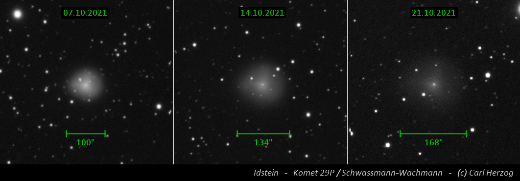 Schwarz-Weiß Aufnahmen vom Kometen 29P im Abstand von je einer Woche, mit einer Schätzung der
