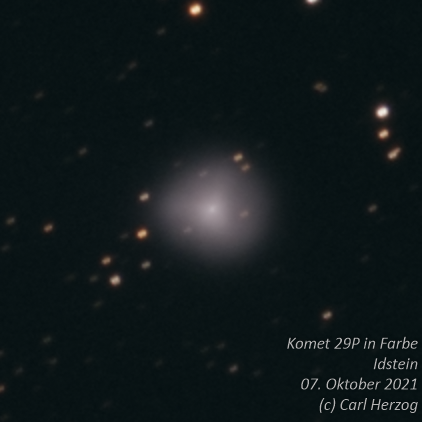 Bei diesem Kometen handelt es sich um einen im Durchmesser ca. 60 km großem Himmelskörper, der in einer kreisrunden Bahn zwischen Jupiter und Neptun die Sonne umkreist, rund fünfmal weiter als die Erde von der Sonne entfernt. Da er sich dabei nie richtig der Sonne nähert, bildet er weder einen Schweif noch die typische grünbläulich leuchtende Kometenkoma. Dennoch kommt es auf diesem Kometen rund 7 Mal pro Jahr zur Bildung einer Koma aufgrund von Kryovulkanismus - dieser Komet hat also Eisvulkane. Unter der gefrorenen Eisoberfläche von 29P befinden sich flüchtige Stoffe wie Methan und CO2, die in regelmäßigen Abständen die Eisschicht durchbrechen, und dann kommt es zu einer Eruption. Durch die geringe Masse des Kometen ist seine Anziehungskraft sehr gering, wodurch das bei der Eruption ausgetretene Material fast ungebremst in den Weltraum entweicht. Dies führt zu einem schnellen Wachstum der Koma, wie die obigen Aufnahmen zeigen. Die folgende Farbaufnahme zeigt die farblose Koma. Außerdem sind drei Strahlen in der Koma im Abstand von ca. 120° zu erkennen, die wahrscheinlich durch die Eruption(en) entstanden sind. |