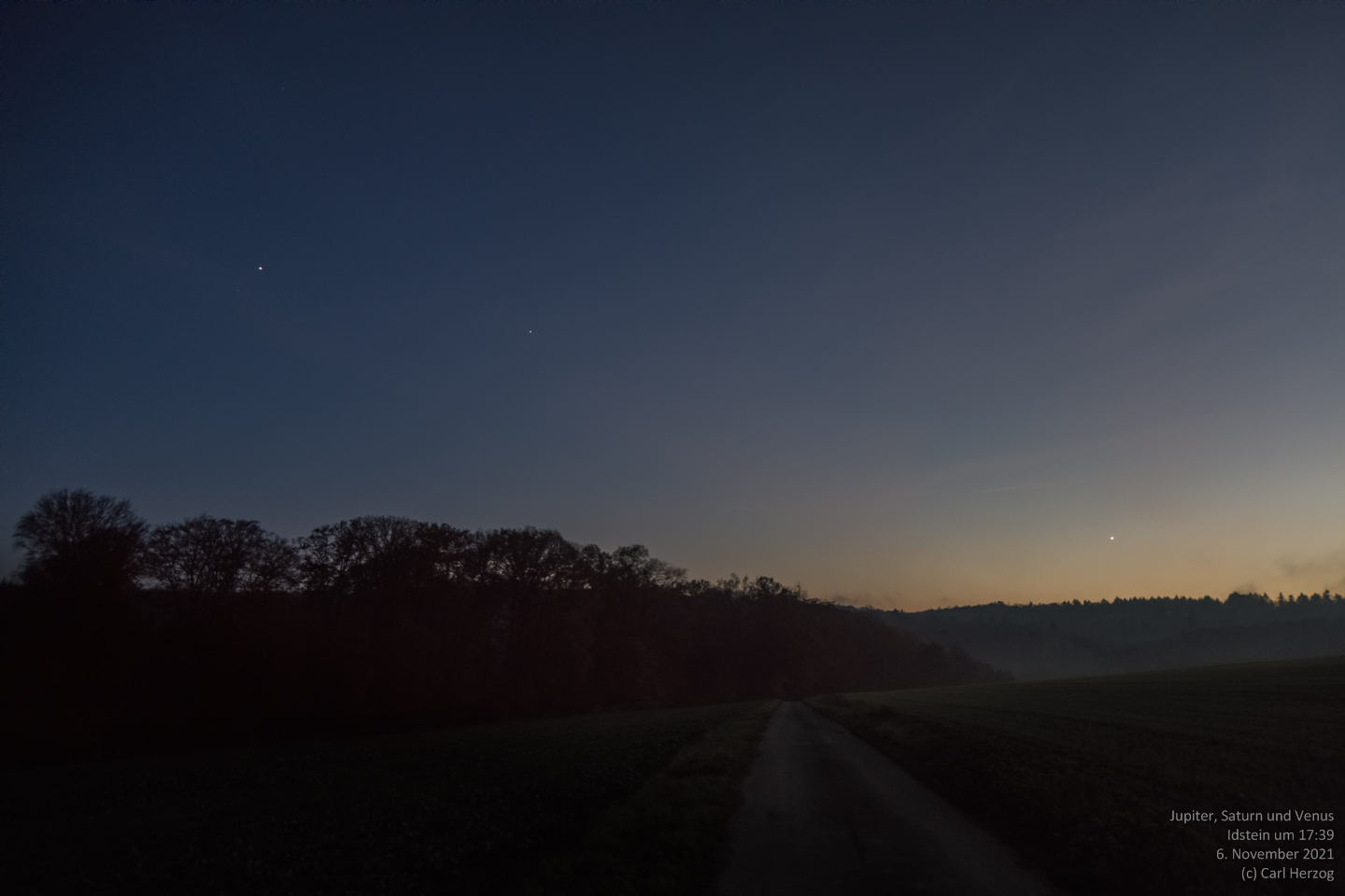 Diese Aufnahme entstand am 6. November 2021 bei einer Fahrrad/Foto-Tour durch neblige Landschaften an einer Hanglage zwischen Bermbach und Idstein, rund 45 Minuten nach Sonnenuntergang - kurz nach dem Übergang von der bürgerlichen zur nautischen Abenddämmerung. Das frühe Dunkelwerden und die Position der Planeten bieten derzeit eine günstige Gelegenheit, um die hellen Planten mit bloßem Auge während der Abenddämmerung sehen zu können. Ungefähr eine Viertelstunde nach Sonnenuntergang erstrahlt Venus tief am Süd-Südwest Horizont. Eine weitere Viertelstunde später ist Jupiter in Richtung Süd-Südost bei knapp über 20° Erhebung zu sehen. Und nochmals 20-30 Minuten später ist der Himmel dunkel genug, damit man im Süden auch Saturn mit bloßem Auge sehen kann. Vom 7. bis 12. November (2021) zieht dann auch noch die zunehmende Mondsichel an der Planetenreihe vorbei. |