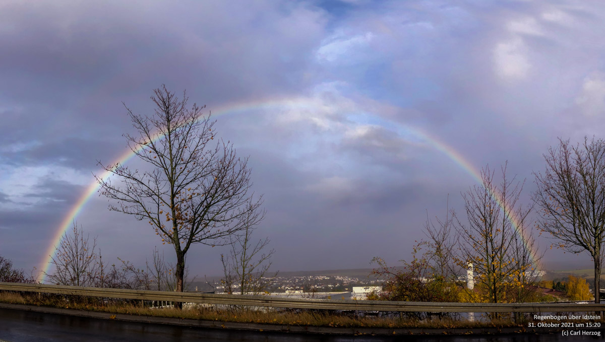 Die untere Aufnahme habe ich am 31. Oktober 2021 um 15:20 (Sonnenhöhe: 13°) von der anderen Stadtseite aus gemacht. Die Aufnahmen entstanden mit Handys unterschiedlicher Hersteller, die aber zufälligerweise den gleichen Sensor und das gleiche Objektiv verwenden, wodurch sie im Maßstab 1:1 verglichen werden können. Die Recherche und Bildanalyse ergaben, daß es sich beim oberen Bild um einen Wolkenbogen handelt. Wie beim Regenbogen wird Sonnenlicht an Wassertröpfchen in der Luft reflektiert und das Licht wird vor und nach der Reflektion jeweils an der Tropfenoberfläche gebrochen (Dispersion), wobei jede Wellenlänge unterschiedlich stark bricht, und so die charakteristische Farbgebung des Regenbogens entsteht. Beim Wolkenbogen (und auch beim direkt verwandten Nebelbogen) sind die Tropfengrößen wesentlich kleiner, wodurch ein zusätzlicher Effekt auftritt: die Beugung (Diffraktion), durch die das Licht von einem Hindernis dermaßen abgelenkt wird, daß sie in alle Richtung gestreut wird. Durch diese Streuung überlagern sich die unterschiedlichen Wellenlängen: der Bogen erscheint dabei umso farbloser und diffuser, je kleiner die Tröpfchen sind, da die Beugung dann immer stärker wird. Dadurch ist die Spurbreite des Wolkenbogens deutlich breiter als beim Regenbogen. Der Regenbogen, Wolkenbogen und Nebelbogen haben einen Radius von 42 Grad. Da sie am Sonnengegenpunkt erscheinen, kann ein Teil des Bogens immer dann gesehen werden, wenn die Sonne tiefer als 42° über den Horizont steht (außer man steht am Berg und blickt hinab). Somit kann im Winter den ganzen Tag lang ein Regen-, Wolken- bzw. Nebelbogen auftreten, wenn die Bedingungen stimmen. Da der Bogendurchmesser somit 84° beträgt, braucht man entweder einen Ultra-Weitwinkelobjektiv, um die ganze Bogenbreite auf ein Bild zu kriegen. Daher verhilft man sich oft mit einem Mosaik mehrerer Bilder, die man entweder automatisiert im Handy oder dem PC zu einem Panorama zusammenfügen kann, hier am Beispiel des Regenbogens: |