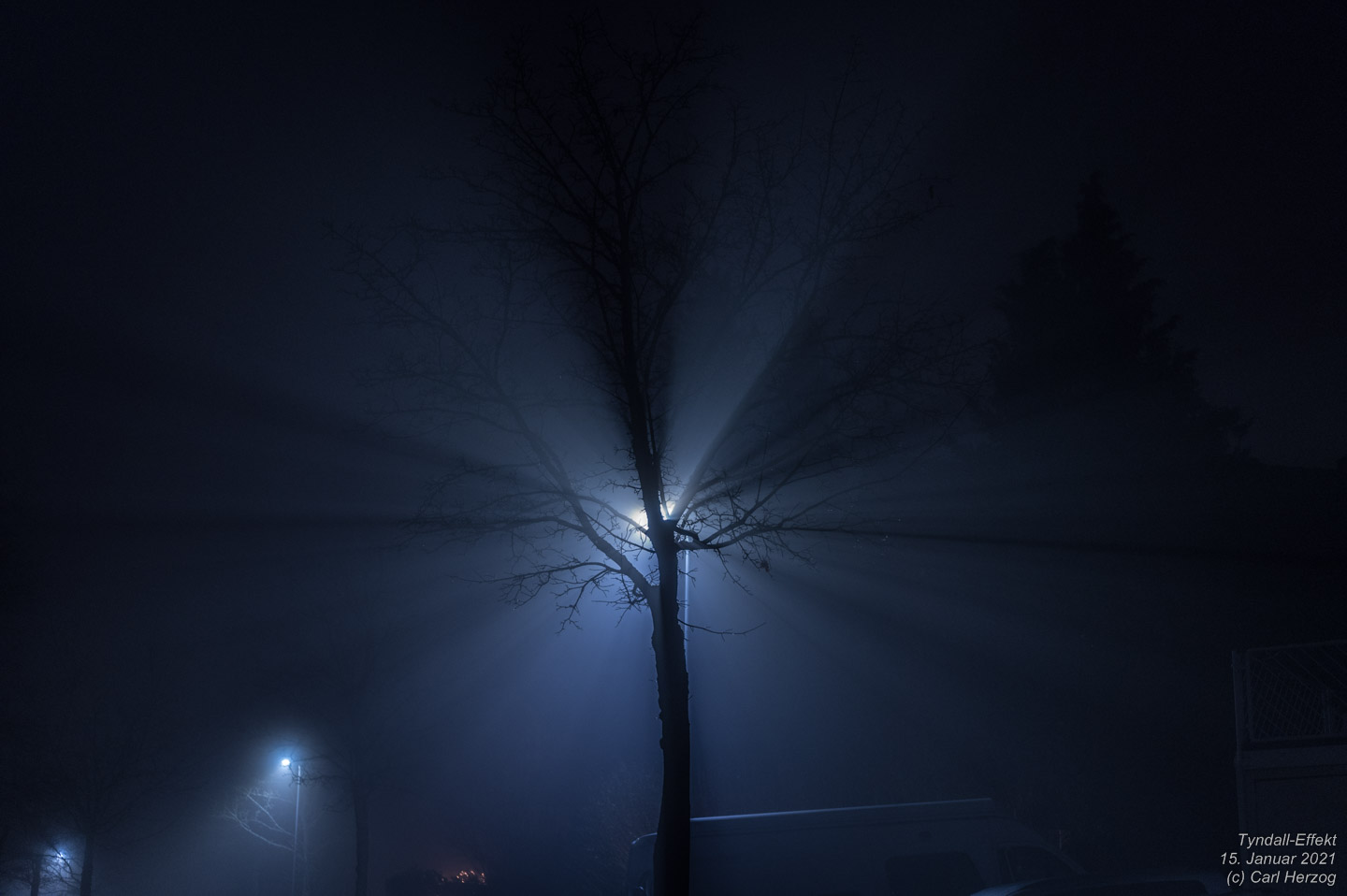 Die schwebenden Wassertröpfchen, die bei dichtem Nebel typischerweise zwischen 0,02mm und 0,04mm groß sind, streuen das Licht (durch die Mie-Streuung). Dadurch werden Lichtstrahlen in der Luft gut sichtbar - es entsteht ein Lichtkegel (durch den Tyndall-Effekt). Steht im Lichtkegel ein lichtundurchlässiges Objekt - wie z.B. ein Baum - bilden sich Strahlenbüschel, die an den Schattenbereichen angrenzen und dadurch ihre Konturen erhalten: |