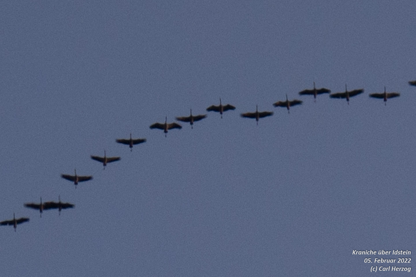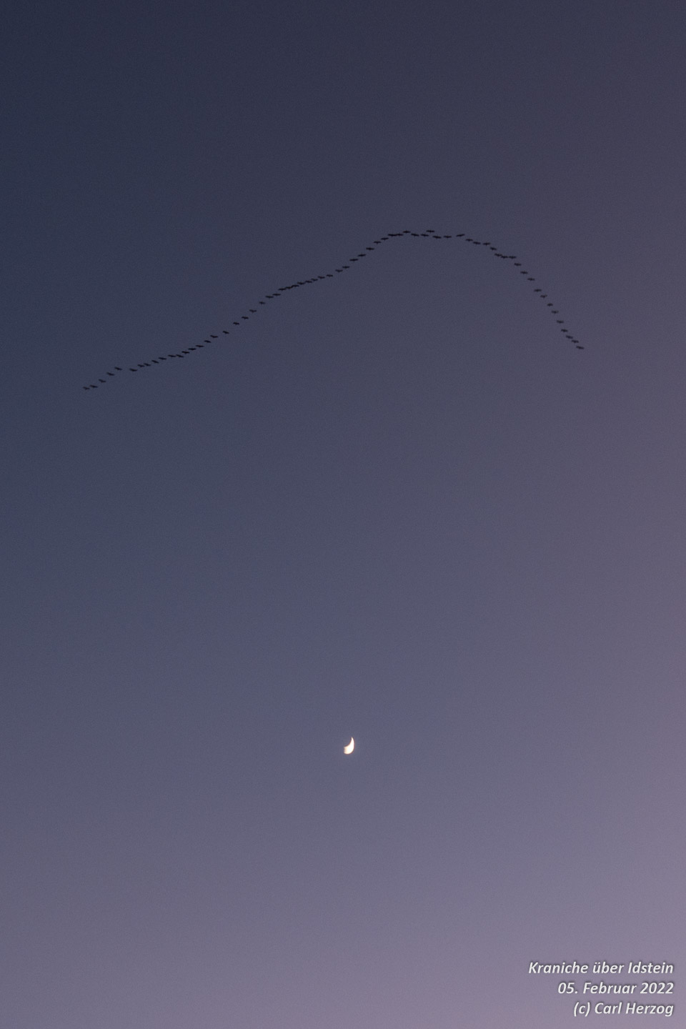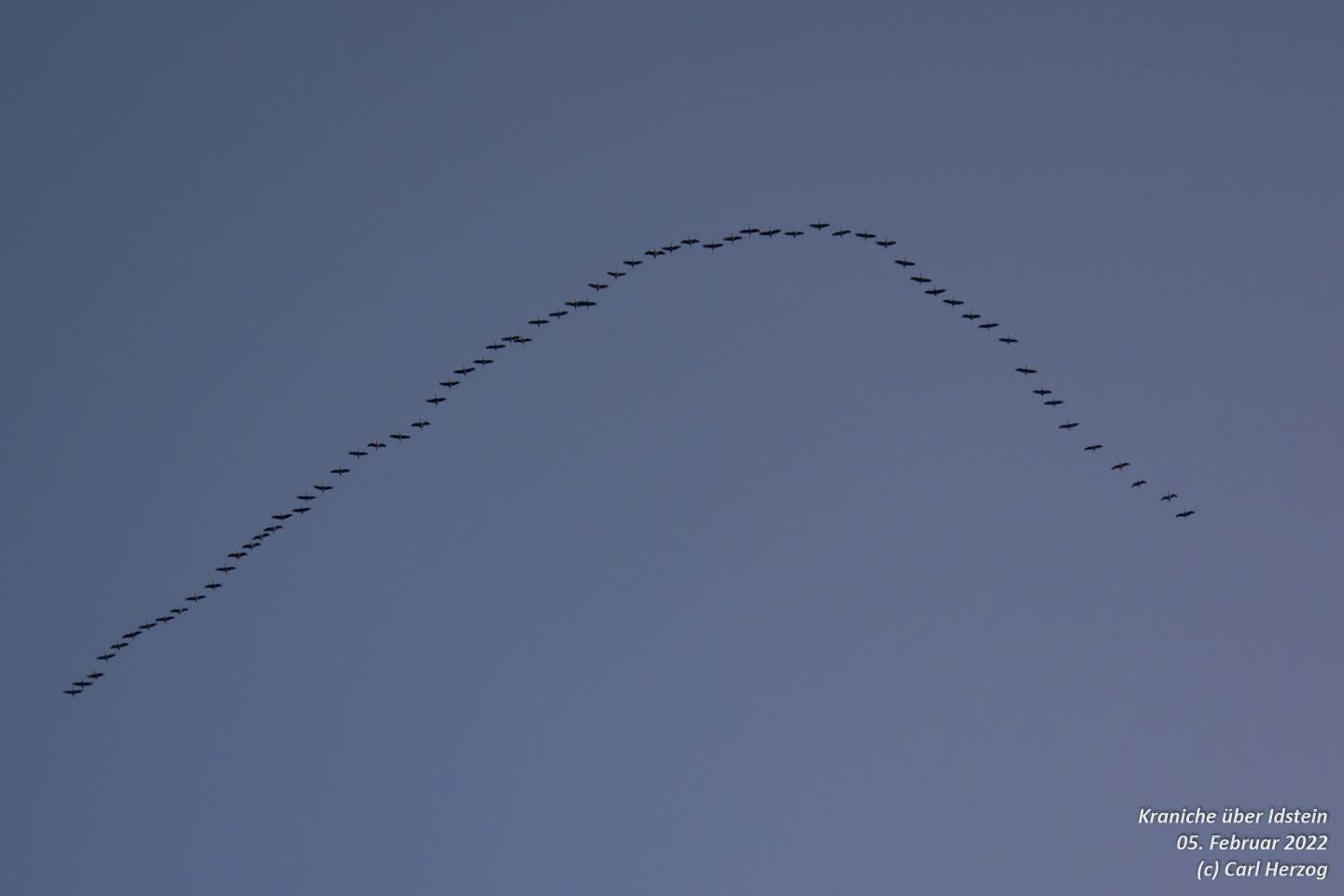 Kraniche bei ihrem Rückflug über Idstein nach Nordosten am Abend des 5. Februar 2022