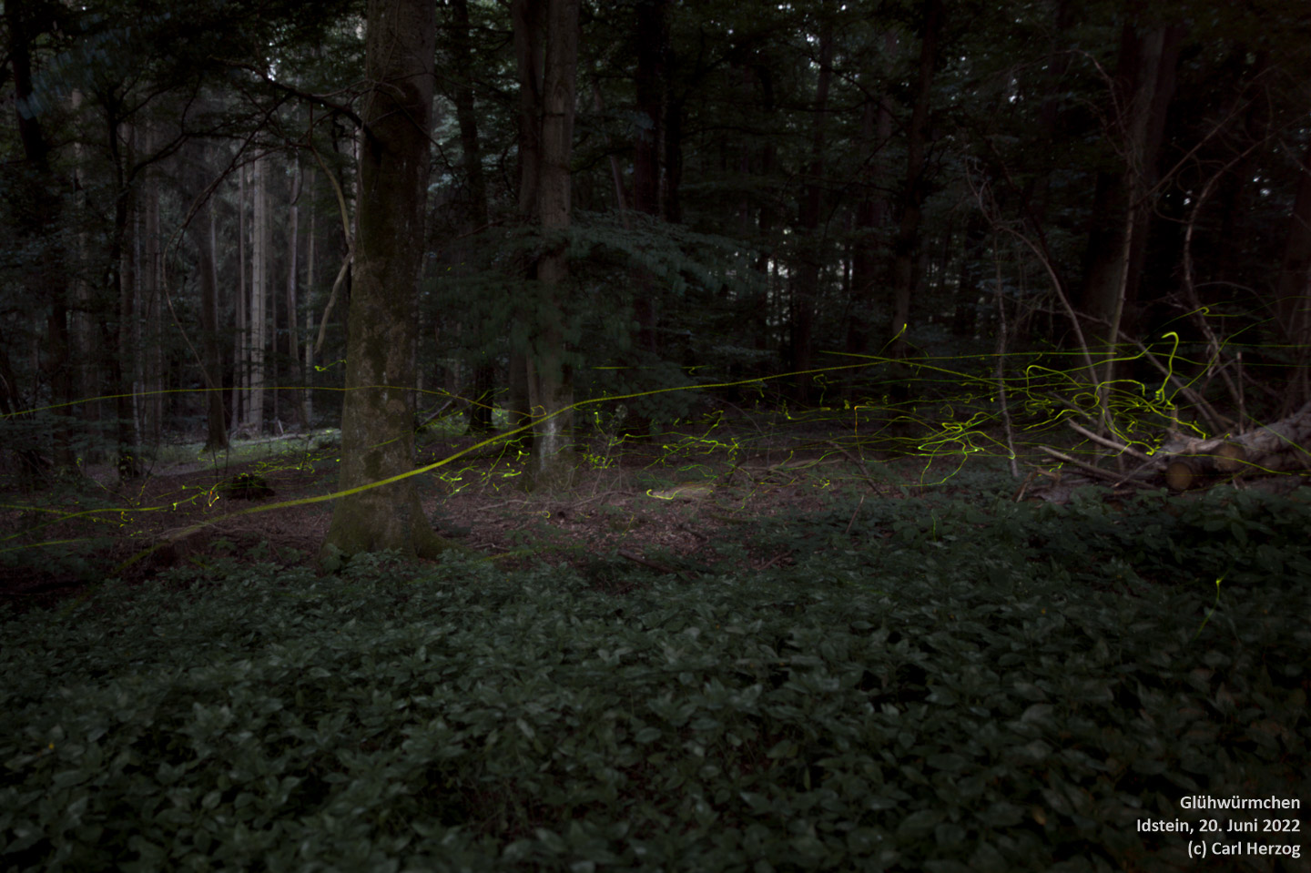 Und heute Sonntag, den 19. Juni, waren an mehreren Stellen im Wald Glühwürmchen unterwegs - hier an einem Waldweg
