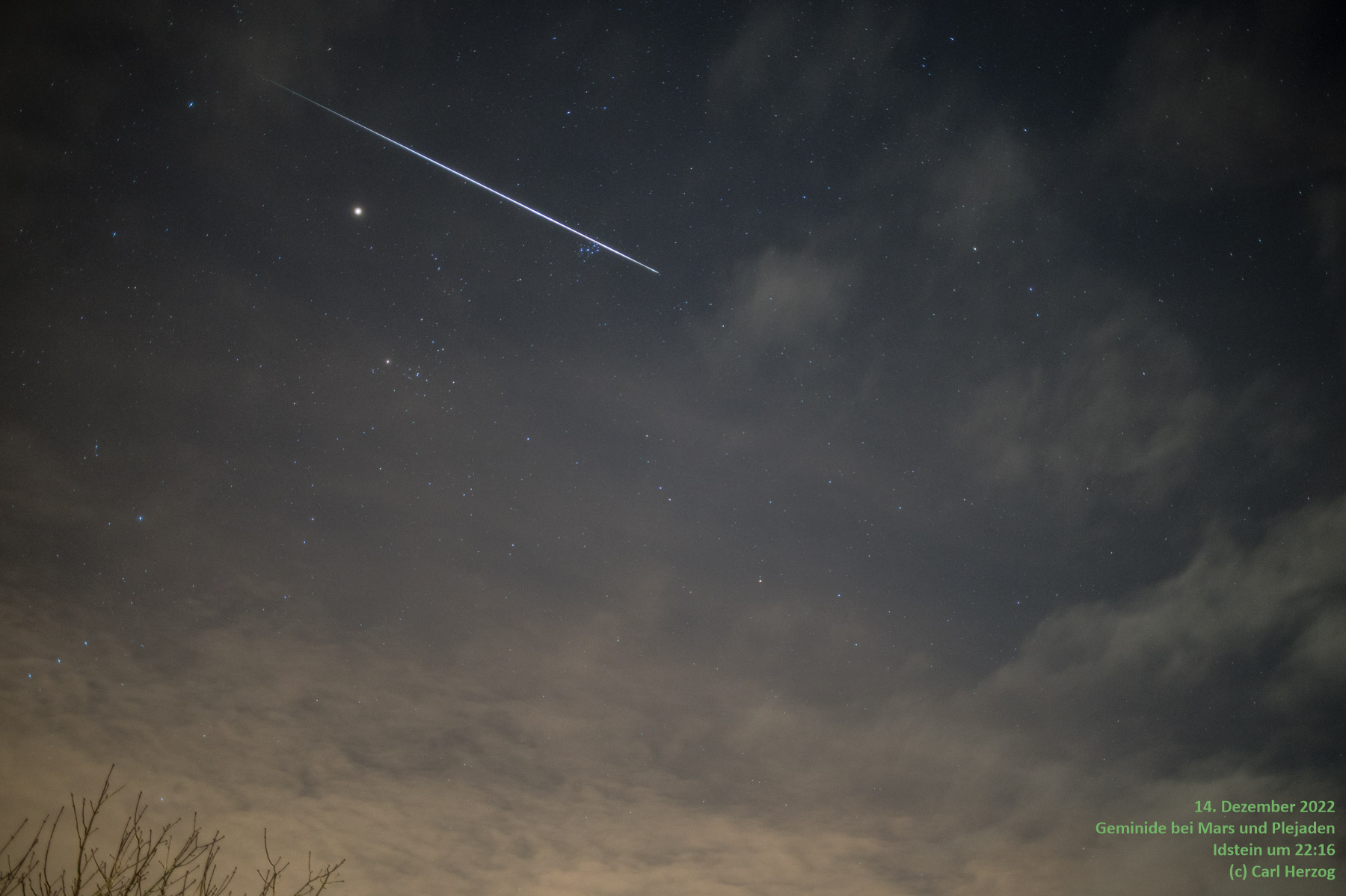 Hier eine Aufnahme vom letzten Jahr mit einer hellen Geminide, die leicht oberhalb vom Mars (der hellste Punkt im Bild) und mitten durch die Plejaden (der kleine bläuliche Sternhaufen) schießt: |