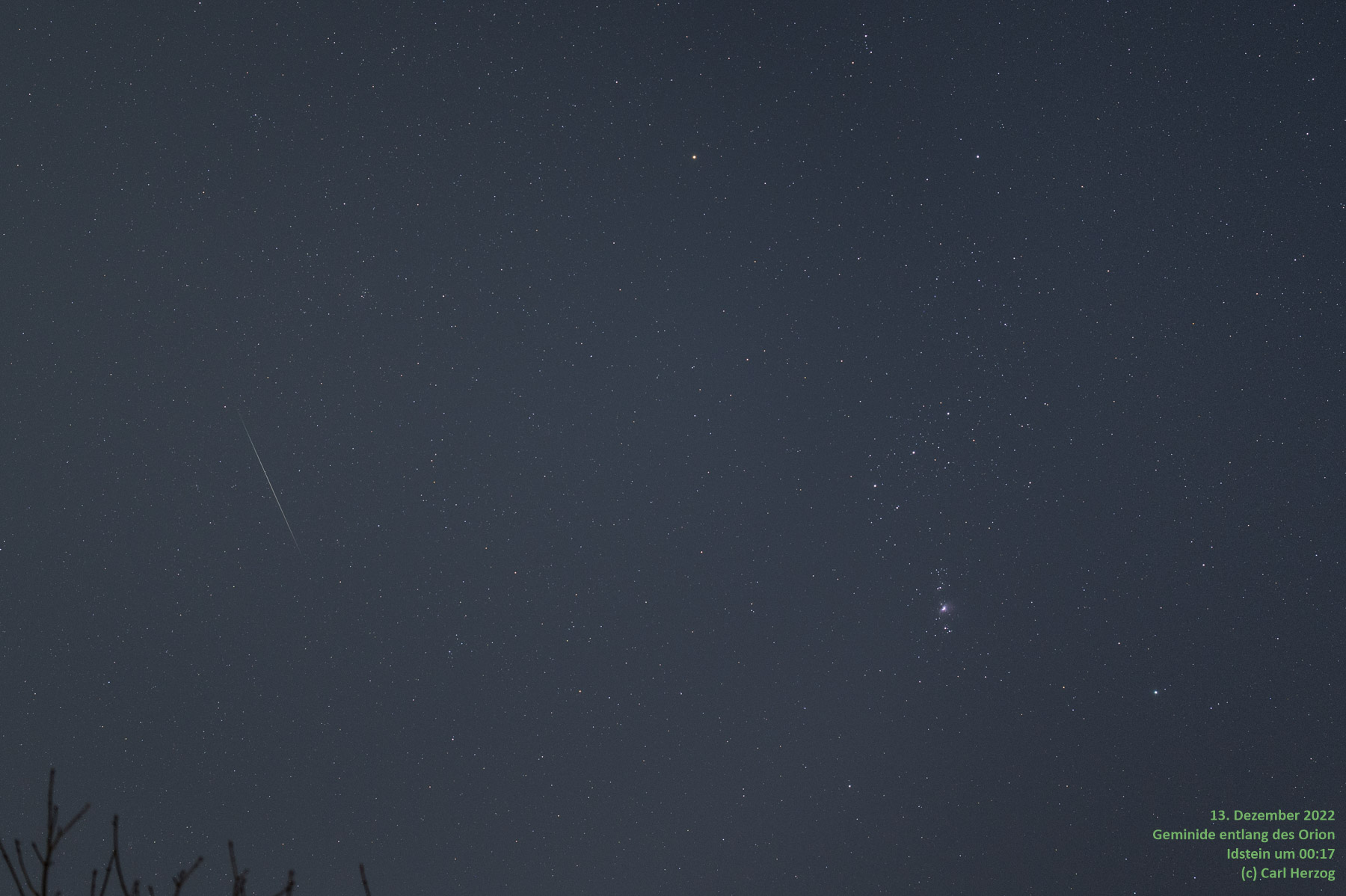 Hier ein weiteres Foto vom letzten Jahr, mit einem eher unauffälligen Exemplar der Geminiden, der links entlang des Sternbild Orion vorbeifliegt (der Orion erstreckt sich über die gesamte rechte Bildhälfte): |