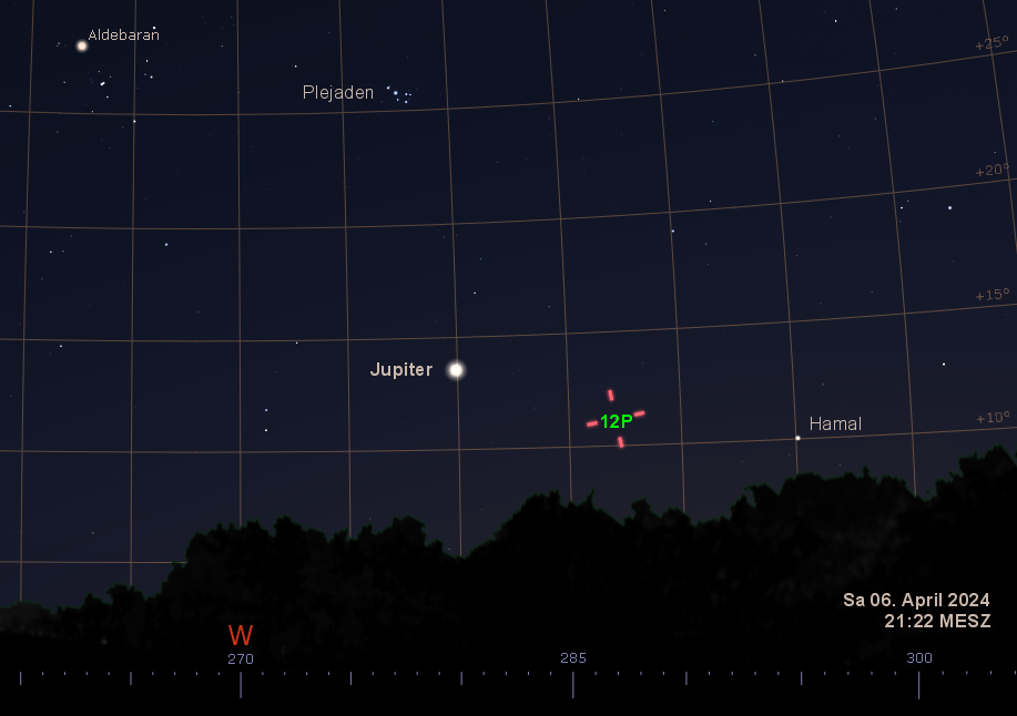 Wie schon mehrfach in der Presse nachzulesen war, ist Komet 12P / Pons-Brooks gerade "zu Besuch" bei uns. Da er mit 71 Jahren eine ähnlich lange Laufzeit wie Komet Halley hat, ist es - für die meisten von uns - ein Komet, den man wahrscheinlich nur einmal im Leben zu Gesicht bekommt. Er erreicht gerade seine maximale Helligkeit, verschwindet allerdings in einigen Tagen vom Abendhimmel. Er ist abends tief im Westen bei ca. 10° Höhe und ganz nah bei Jupiter zu sehen, wobei man zumindest ein kleines Fernglas benötigt, um ihn zu entdecken. Man wird dabei freilich nicht etwas wie im obigen Bild sehen, sondern nur den hellen Kopf des Kometen als schwammigen Fleck, aber immerhin deutlich größer als ein Stern oder als Jupiter, und daher ganz gut auszumachen. Hier seine Position (als grünes 12P markiert) am Samstag, den 06. April um 21:22, er befindet sich dabei ca. 8° rechts vom Jupiter: |