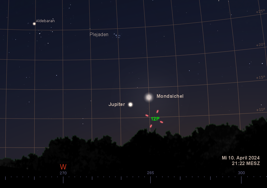 Was man aufgrund der niedrigen Höhe auch benötigt ist eine klare Horizontsicht. Regen und Wind am Tag sind dabei unser Freunde: sie spülen und fegen den ganzen menschengemachten Feinstaub weg und sorgen für klare Sicht sowie auch weniger Einfluss der Lichtverschmutzung. Am kommenden Mittwoch, den 10. April gesellt sich die dünne Mondsichel hinzu - das dürfte dann die letzte Gelegenheit sein, den Kometen noch zu erhaschen: |