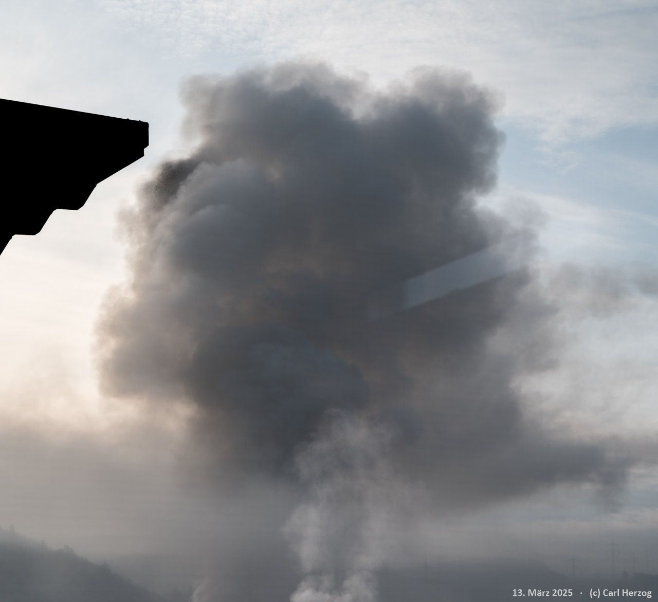 Als dann um 10:15 plötzlich ein lauter Notfall-Alarm am Handy losging dachte ich das Feuer breitet sich weiter aus! Wie sich schnell herausstellte war es aber ein planmäßiger Test-Alarm in ganz Hessen. Es ist zwar gut, daß es jetzt endlich - nach zig Anläufen - endlich mal auch an meinem Handy ankommt. Vor lauter Test-Alarme und -Sirenen besteht allerdings die Gefahr, daß man irgendwann die echte Warnung vor dem Wolf ignoriert. Abschließend ein Zeitraffer von 05:00 bis 09:30 der Himmelansicht - so lange waren noch Rauchwolken zu sehen (einfach auf den grünen Text klicken, um das Video zu starten). Man kann es möglicherweise im Video erahnen (mit bloßem Auge sah es wesentlich dynamischer und dramatischer aus), und wer schon mal selbst einen Hausbrand erlebt hat wird es sowieso schon wissen: ein Feuer breitet sich irre schnell aus! Im konkreten Fall scheint es sich um ein alleinstehendes Haus gehandelt zu haben, weshalb der Schaden wahrscheinlich enorm sein wird, aber auf das eine Haus begrenzt. Ganz anders kann ein Brand ausgehen, wenn z.B. bei Reihenhäusern Fahrzeuge die engen Zufahrts- und Fluchtwege blockieren. Update vom 14.03.2025
