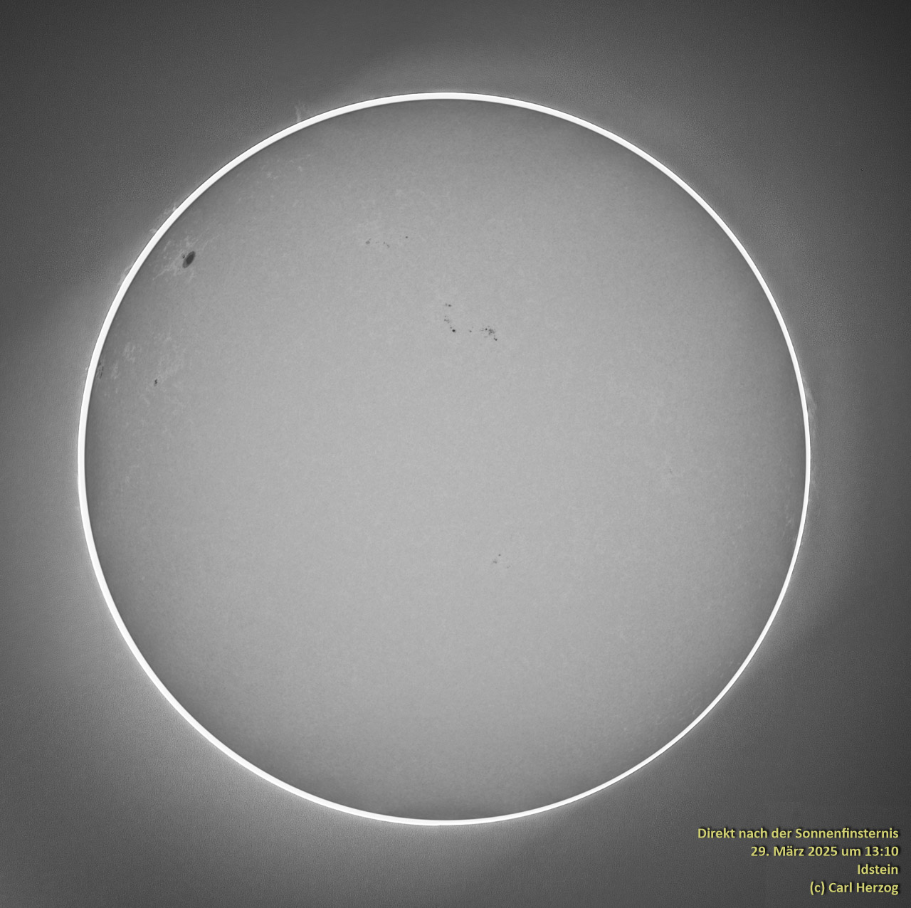 Kurz nach der Finsternis, als es aufklarte, entstand diese Aufnahme der ganzen Sonnenscheibe: