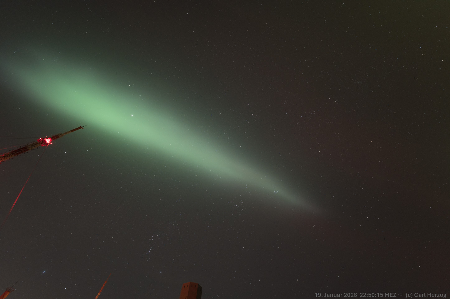 matt-rötlich ein Polarlichstreifen, der in Ost-West-Richtung orientiert war. Und etwas darüber ist ein diffuses