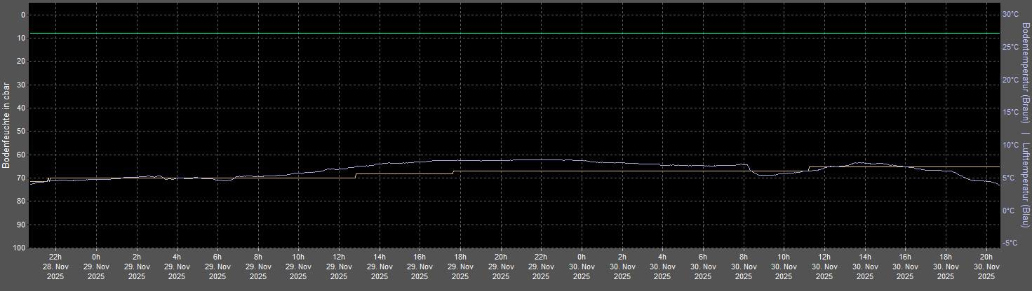 Grün-Gelb-Rote Kurve: Bodenfeuchte in cbar (0 = sehr nasse Erde, 200 = staubtrockene Erde)